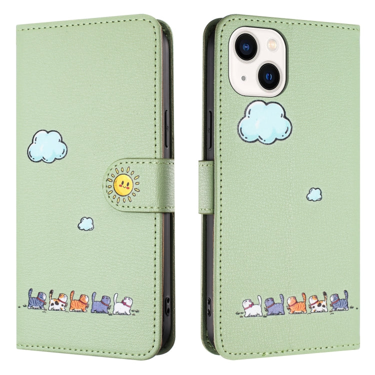 Funda de Cuero para Teléfono iPhone 14/13 con Gatos de Dibujos Animados (Verde)