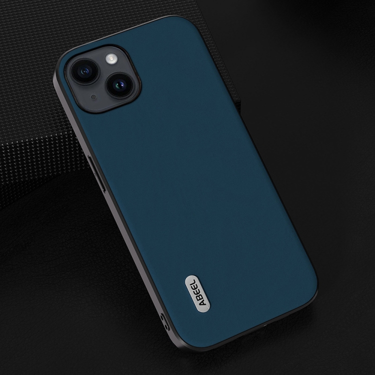 Funda de teléfono Abeel para iPhone 14 con borde negro de cuero genuino (Azul)