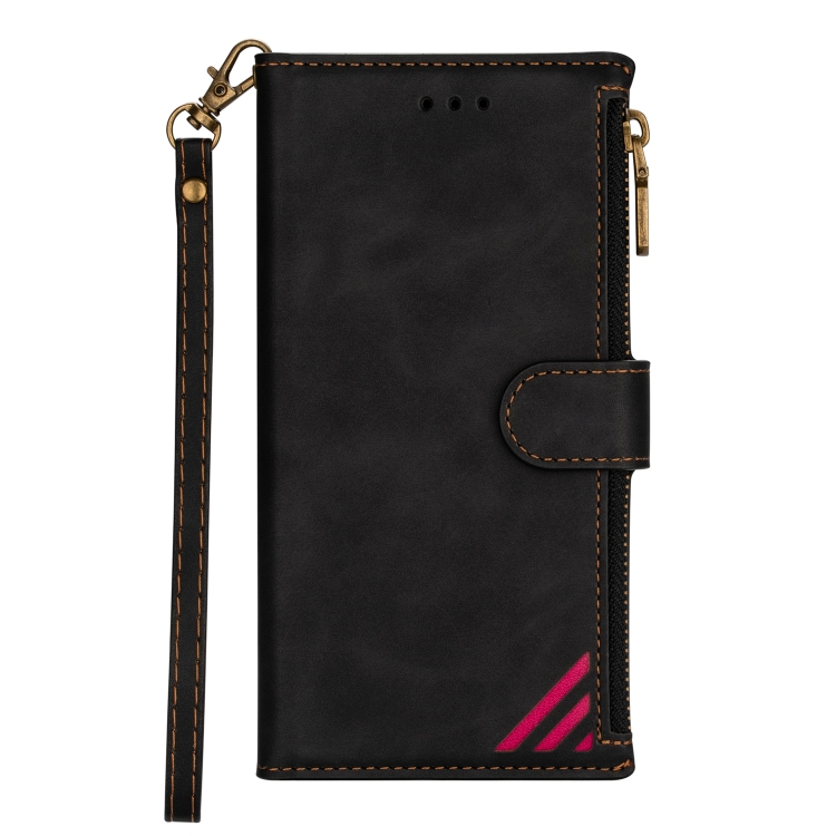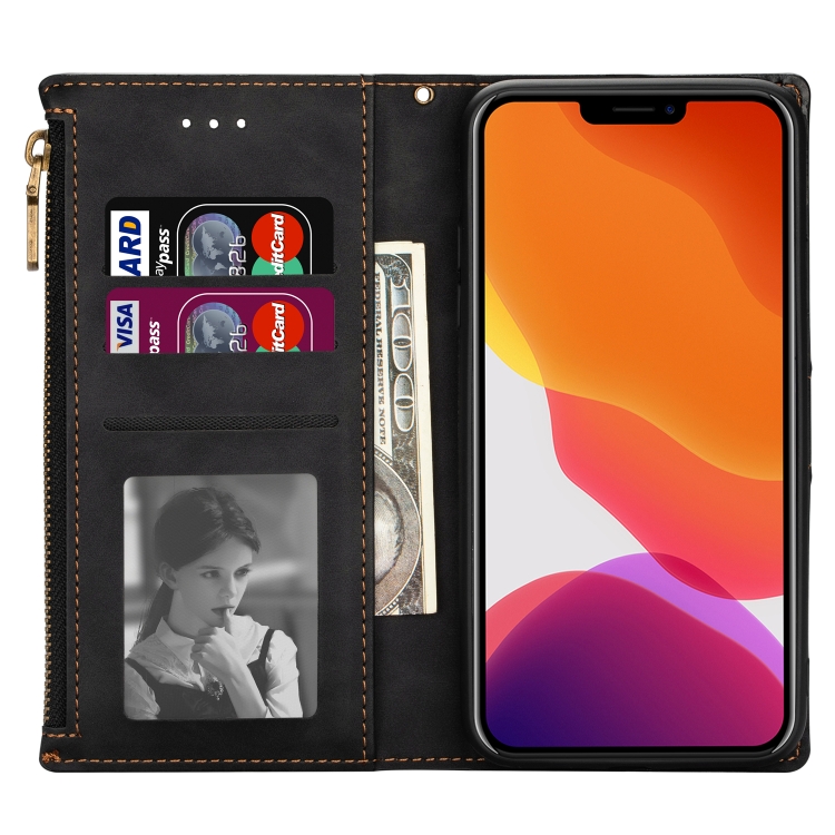Funda de Cuero para iPhone 14 con Cremallera y Ranuras para Tarjetas Múltiples con Tapa Horizontal (Negro)