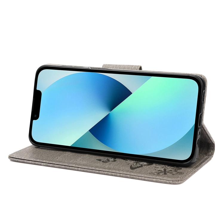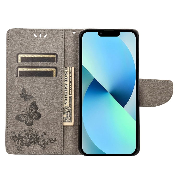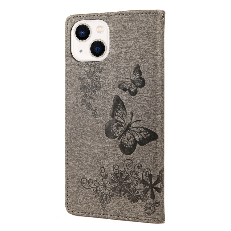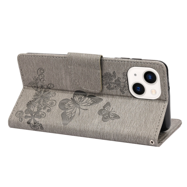 Estuche para Teléfono iPhone 14 Cuero Tapa Horizontal Relieve Mariposa (Gris)