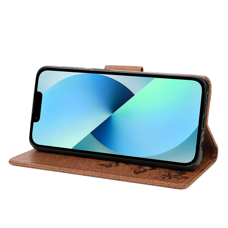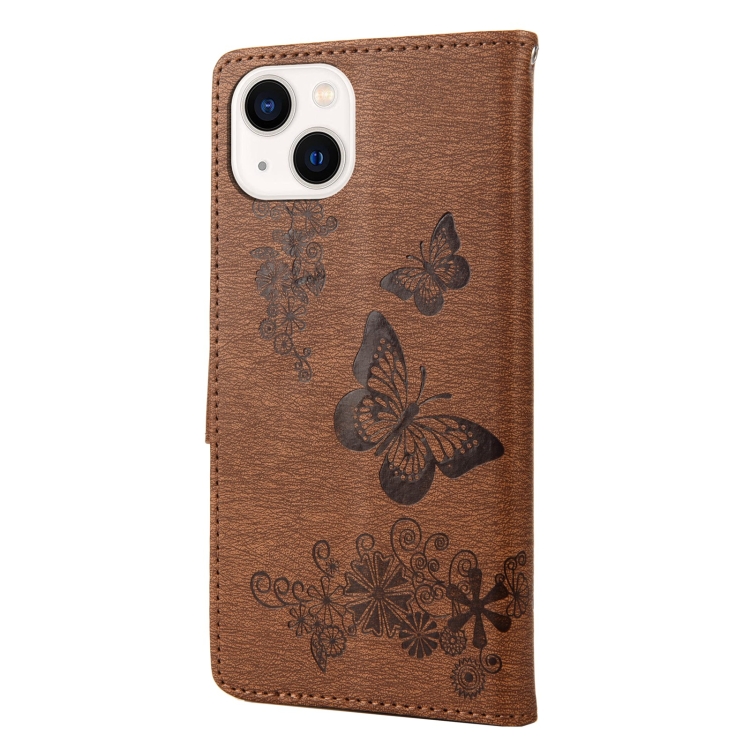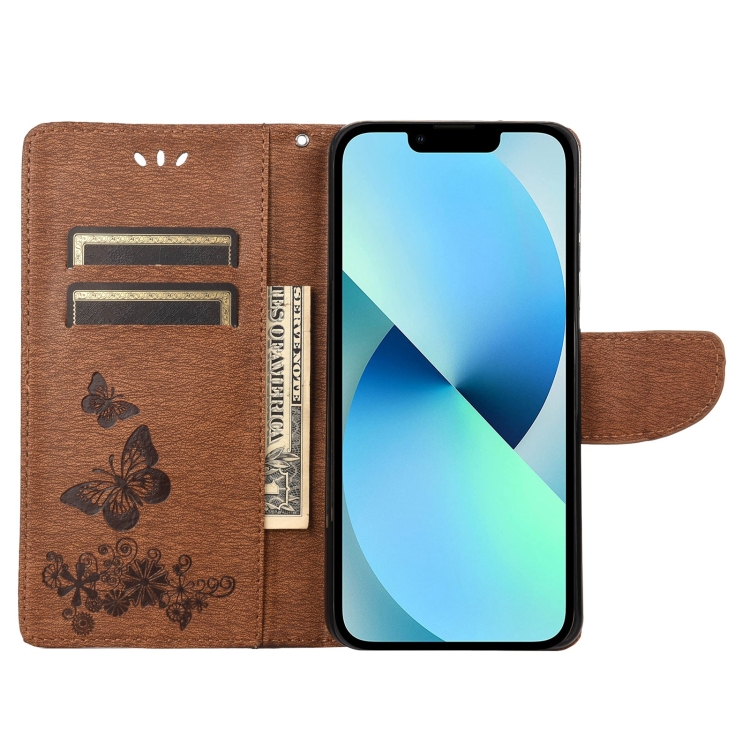 Estuche para Teléfono iPhone 14 Cuero con Tapa Horizontal y Relieve de Mariposa (Marrón)
