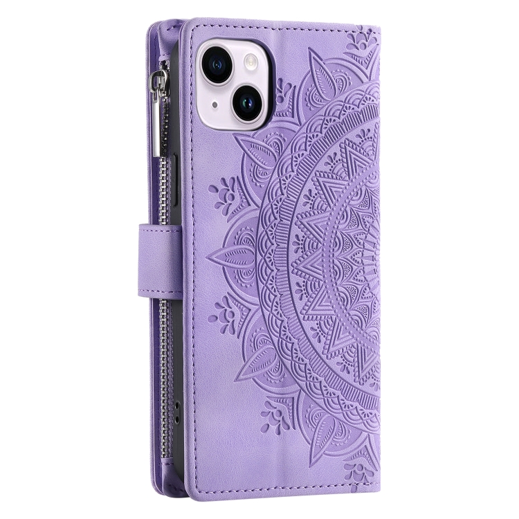 Funda de Cuero iPhone 14 con Cremallera Totem y Múltiples Tarjetas (Púrpura)