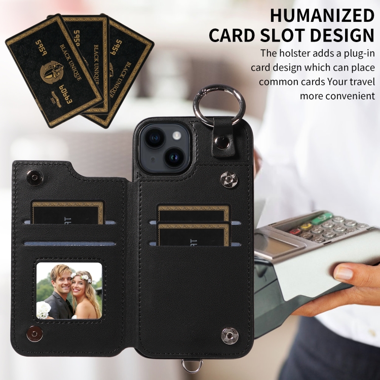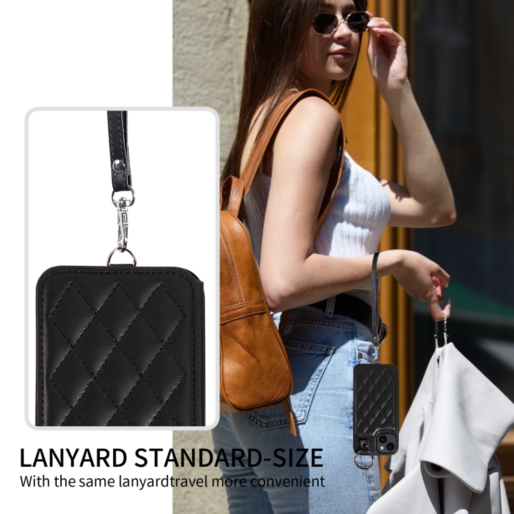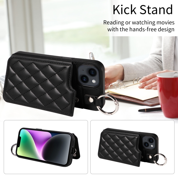 Funda para Teléfono iPhone 14 con Bolsa para Tarjetas Textura Rómbica y Cordón Corto (Negro)