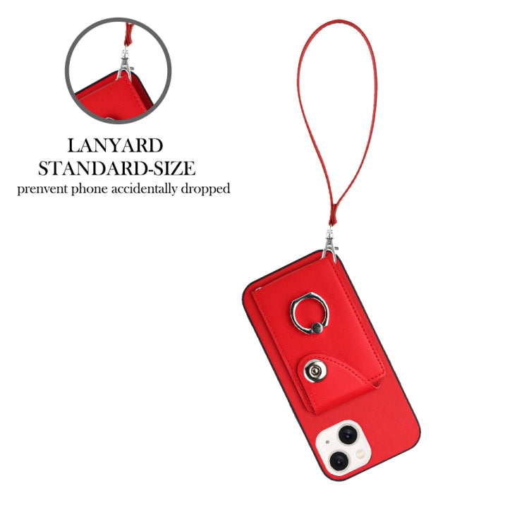 Funda para Teléfono iPhone 14 de PU con Soporte para Anillo y Bolsa para Tarjeta con Cordón (Rojo)