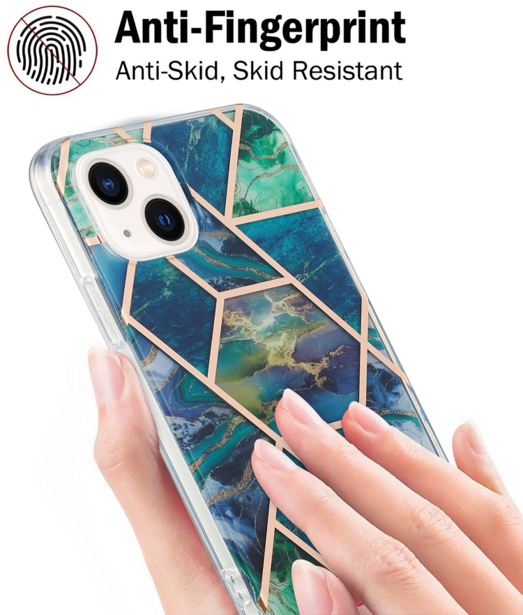 Funda para iPhone 14 Galvanoplastia Empalme Mármol Patrón de Flores Doble Cara Imd TPU a Prueba de Golpes (Azul Verde)