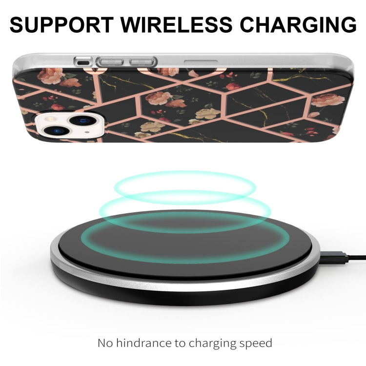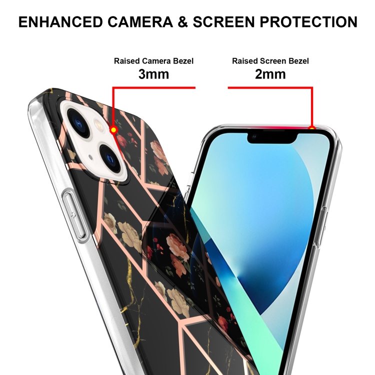Estuche TPU para iPhone 14 Galvanoplastia Empalme Mármol Patrón de Flores a Prueba de Golpes (Flor Negra)