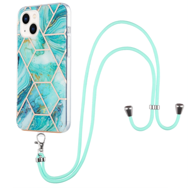 Estuche TPU para iPhone 14 Galvanoplastia Empalme Mármol Doble Cara con Cordón (Azul)