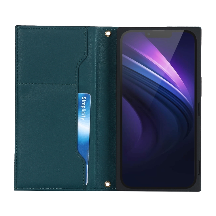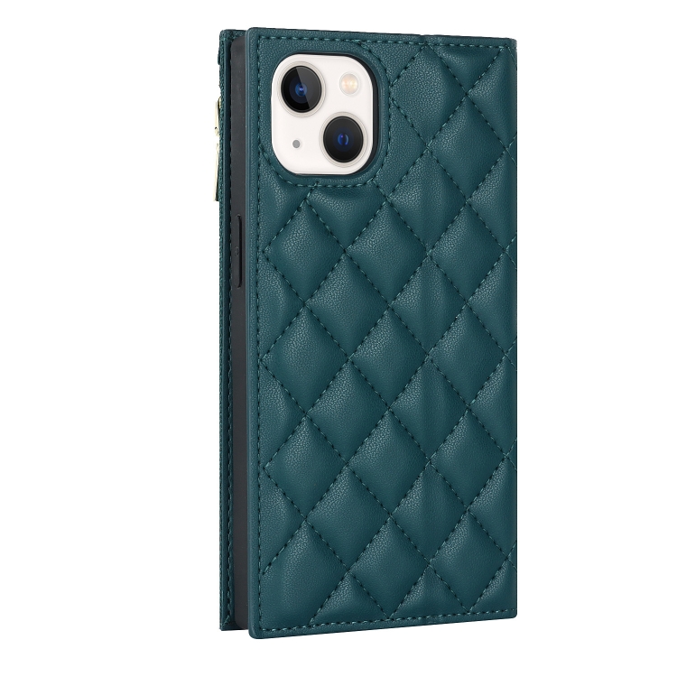 Funda para iPhone 14 Grid Texture Lanyard de Cuero con Cremallera para Teléfono (Verde)
