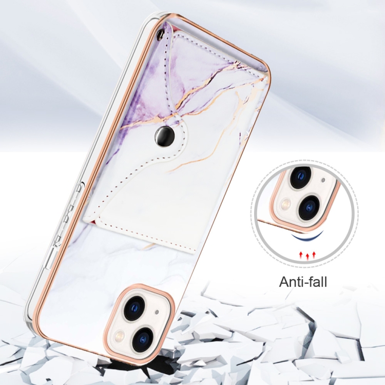 Estuche para Teléfono iPhone 14 Plus con Ranura para Tarjeta IMD Patrón Mármol (Blanco y Morado)