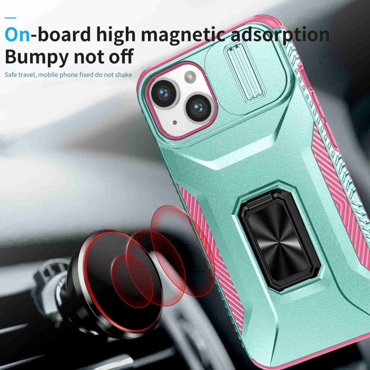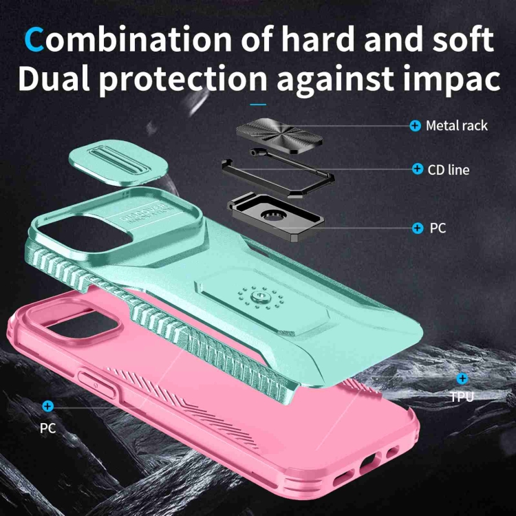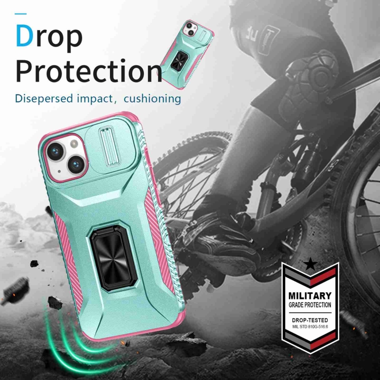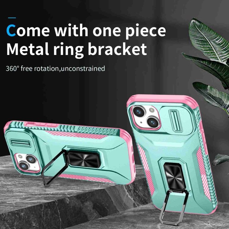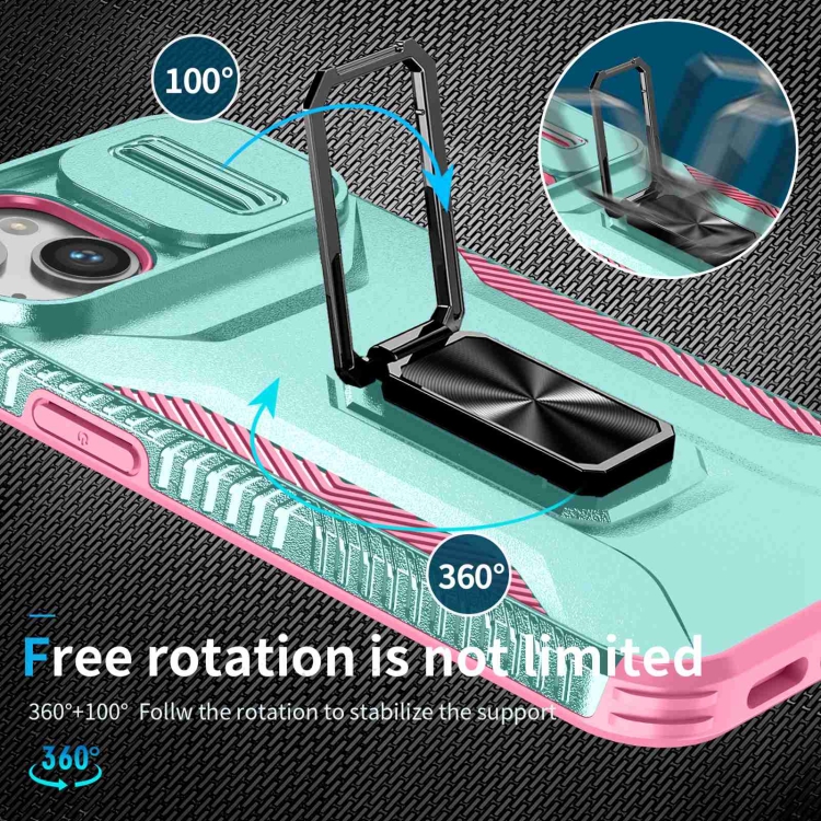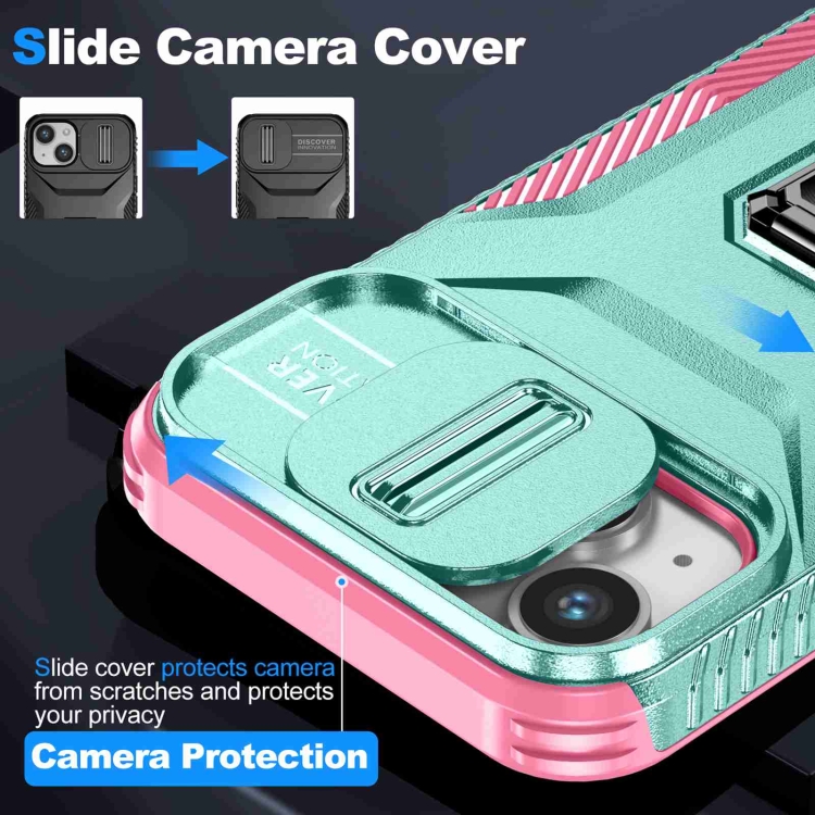 Estuche para teléfono iPhone 14 Plus con soporte deslizante para levas (Gris Verde + Rosa)