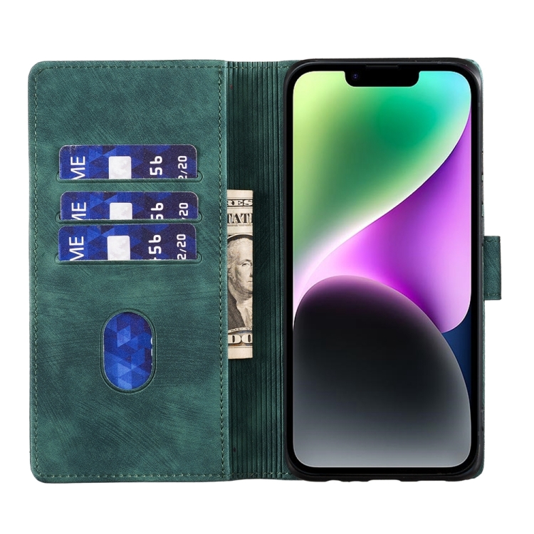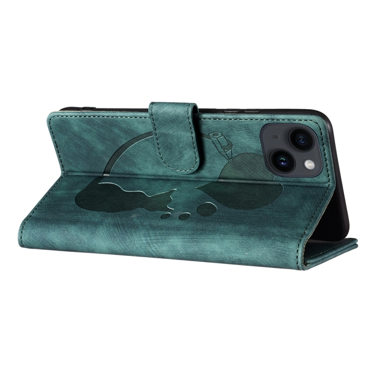 Estuche para Teléfono iPhone 14 Plus Cuero con Relieve de Gato y Corazón (Verde)