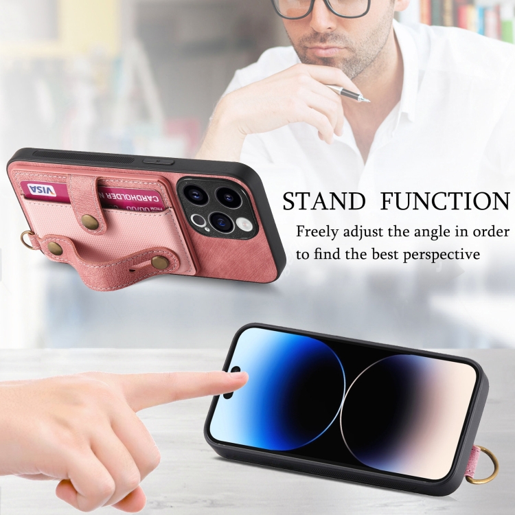Funda Trasera para iPhone 14 Plus Retro Cross Muñequera Monedero Cuero (Rosa)