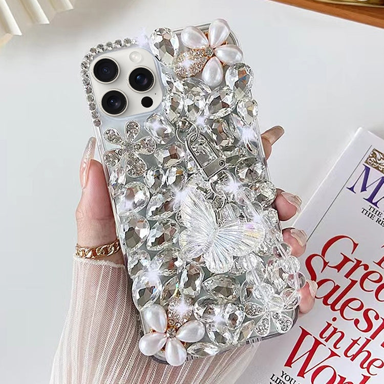 Caja de teléfono para iPhone 14 Pro PC con incrustaciones de diamantes de mariposa hecha a mano (Blanco)
