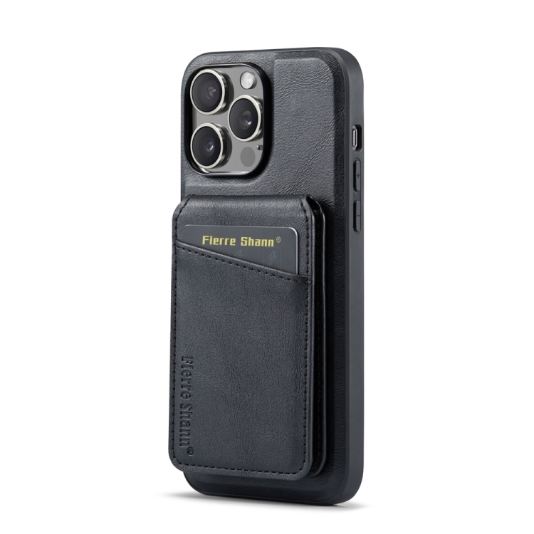 For iPhone 14 Pro Fierre Shann Oil Wax Cowhide Leather Magnetic Card Holder Phone Case (Black)