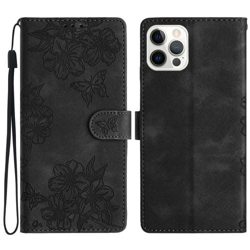 Funda para teléfono Apple iPhone 14 Pro Max Cherry Blossom Butterfly Skin Feel de PU en relieve (Negro)