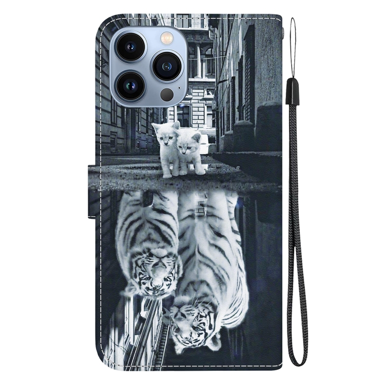 Funda para Teléfono iPhone 14 Pro Max Cuero Dibujo Coloreado Textura Cristal (Reflejo de Tigre Gato)