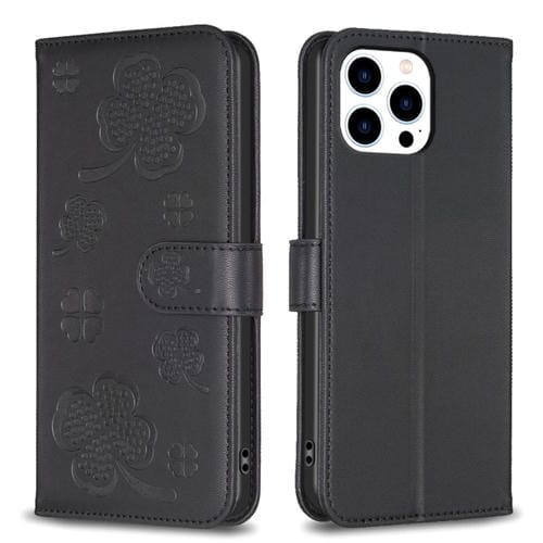 Funda para Teléfono iPhone 14 Pro Max Cuero con Relieve de Cuatro Hojas (Negro)