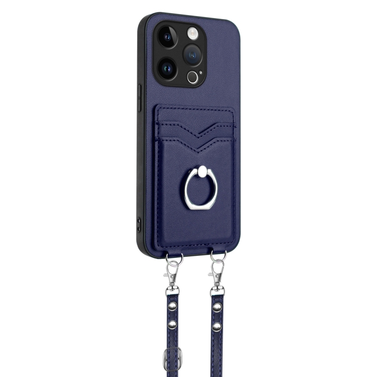 Funda para Teléfono iPhone 14 Pro R20 con Soporte para Tarjeta y Anillo de Cuerda Cruzada (Azul)