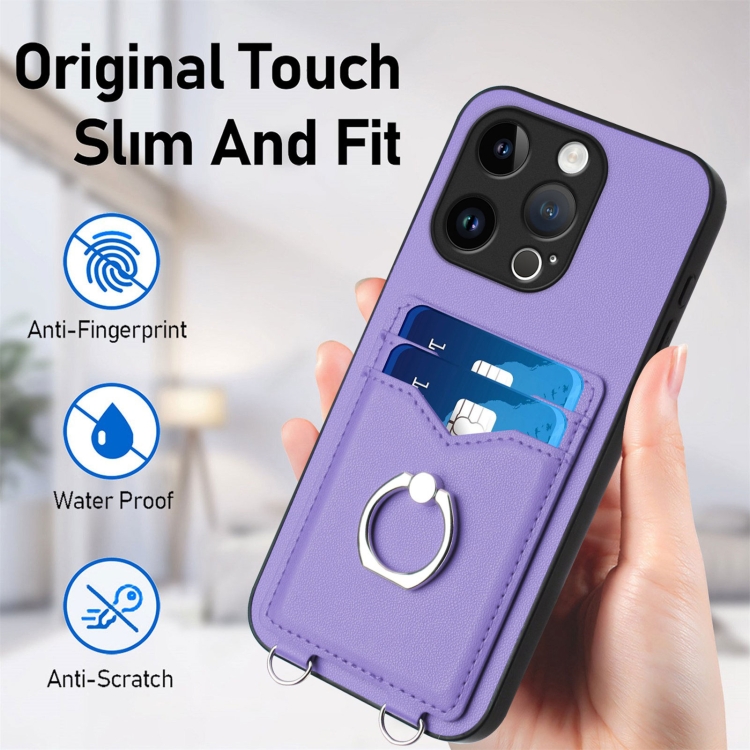Funda para Teléfono iPhone 14 Pro R20 con Soporte para Tarjeta y Anillo de Cuerda Cruzada (Púrpura)