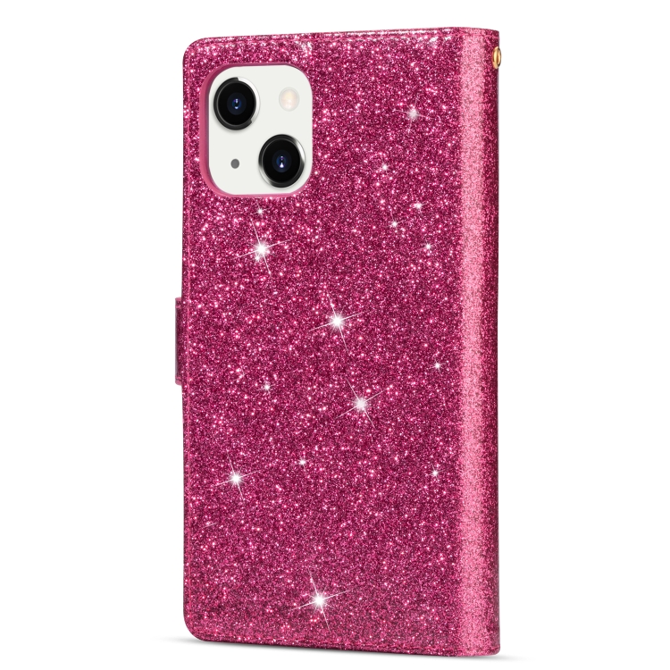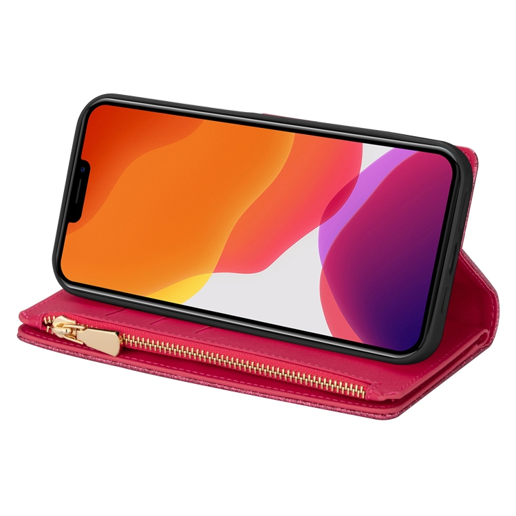 Estuche de Cuero para iPhone 14 con Ranuras Múltiples Tarjetas y Cremallera (Rojo Rosa)