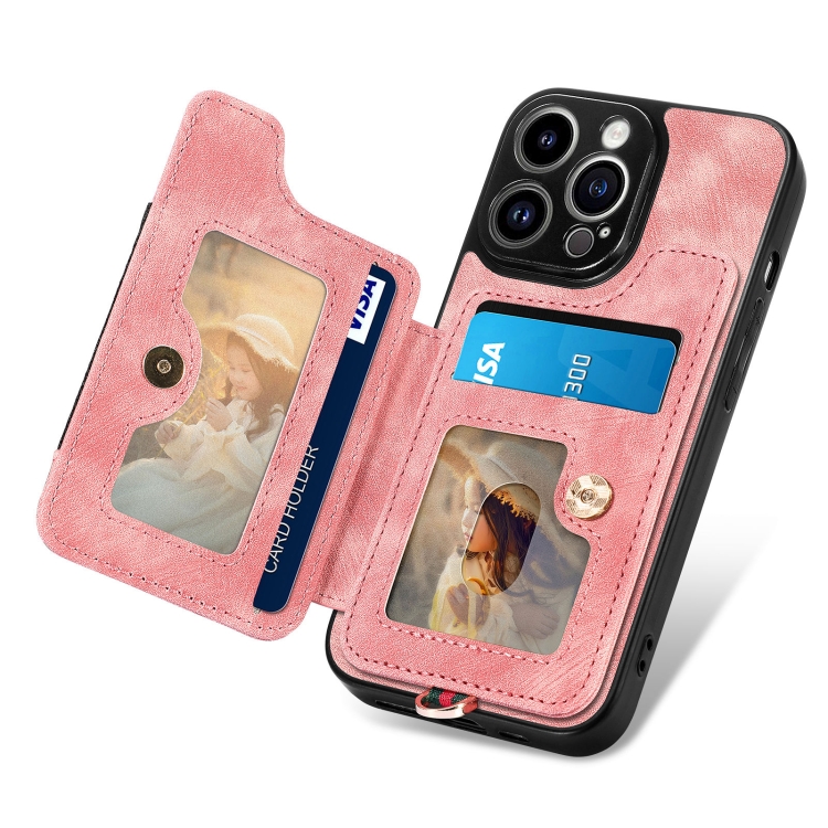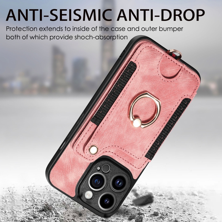 Funda para iPhone 14 Retro Skin-Feel Ring Multi-Card Wallet (Rosa)