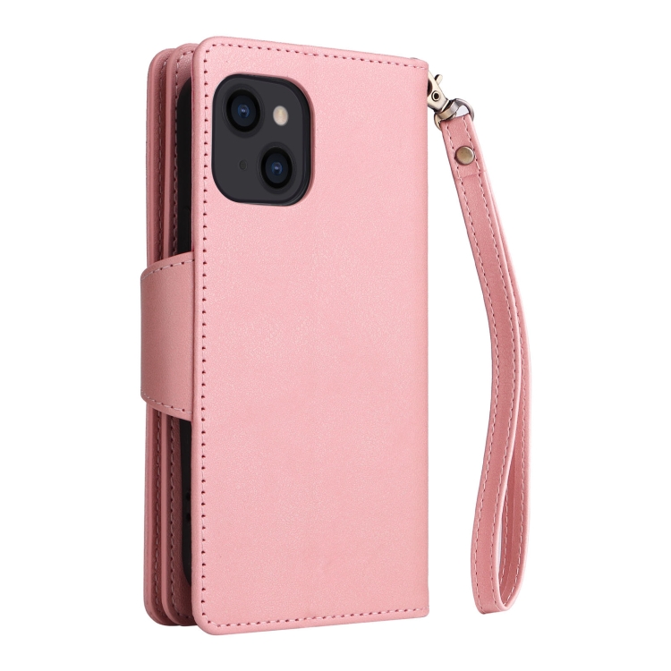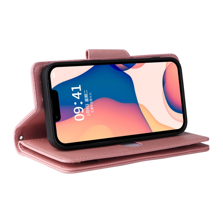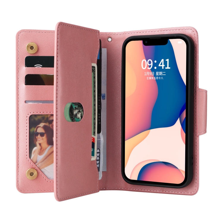 Funda para iPhone 14 Rivet Buckle 9 Cards de Cuero Tres Pliegues (Oro Rosa)