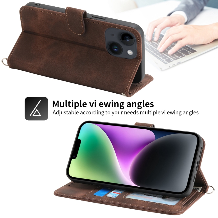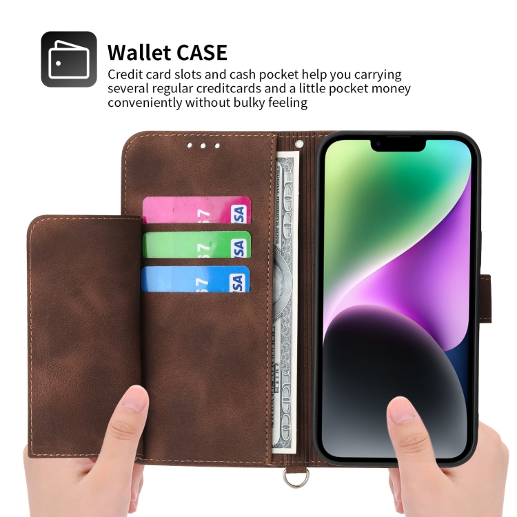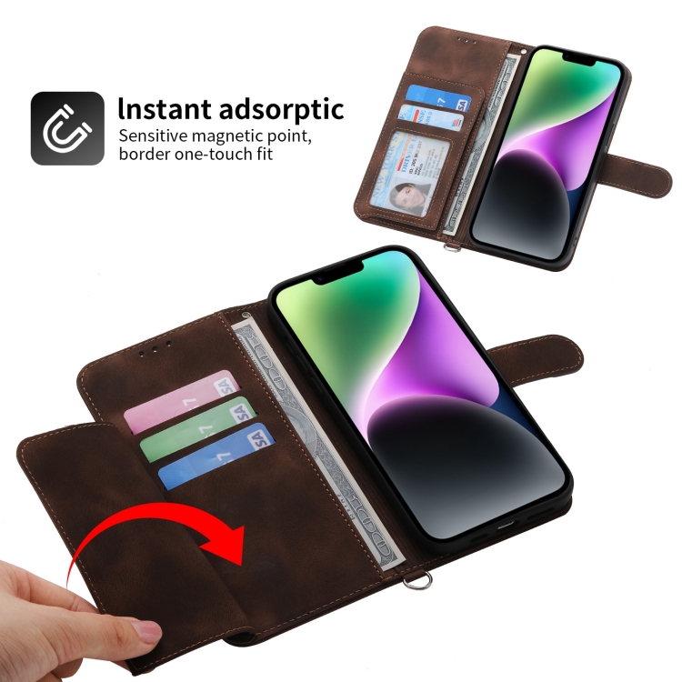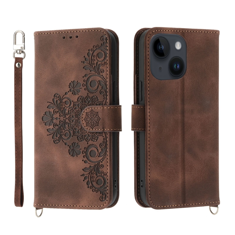 Funda de Cuero Skin-Feel Flowers para iPhone 14 con Billetera en Relieve (Marrón)