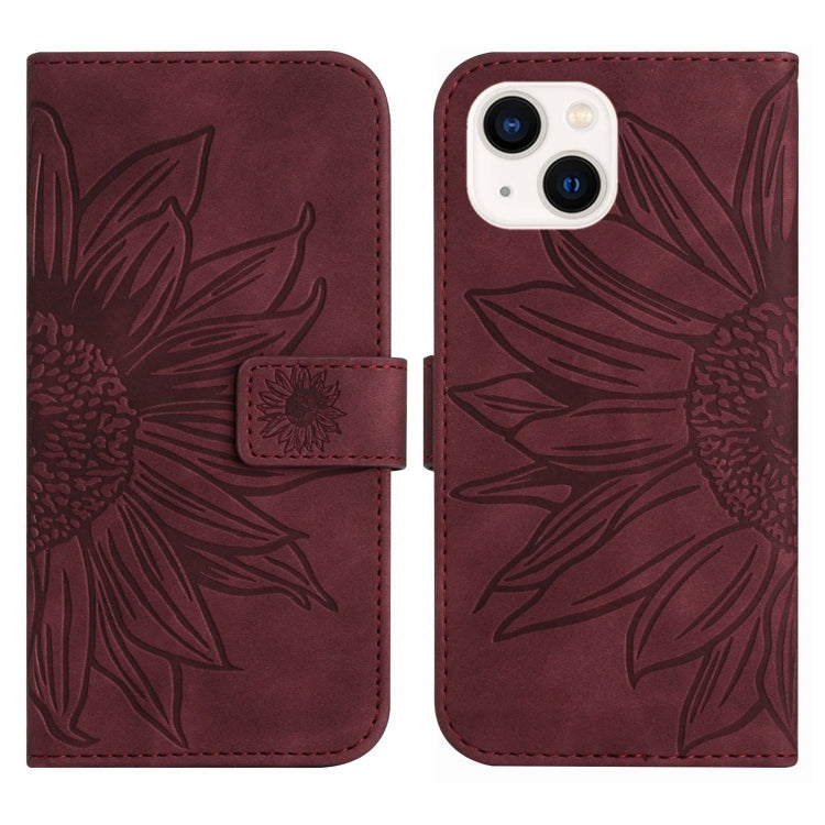 Funda para teléfono iPhone 14 Skin Feel Sun Flower Pattern Flip Cuero con Cordón (Rojo Vino)