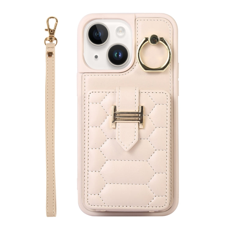 Funda para iPhone 14 Vertical Card Bag Ring Holder con Doble Cordón (Beige)