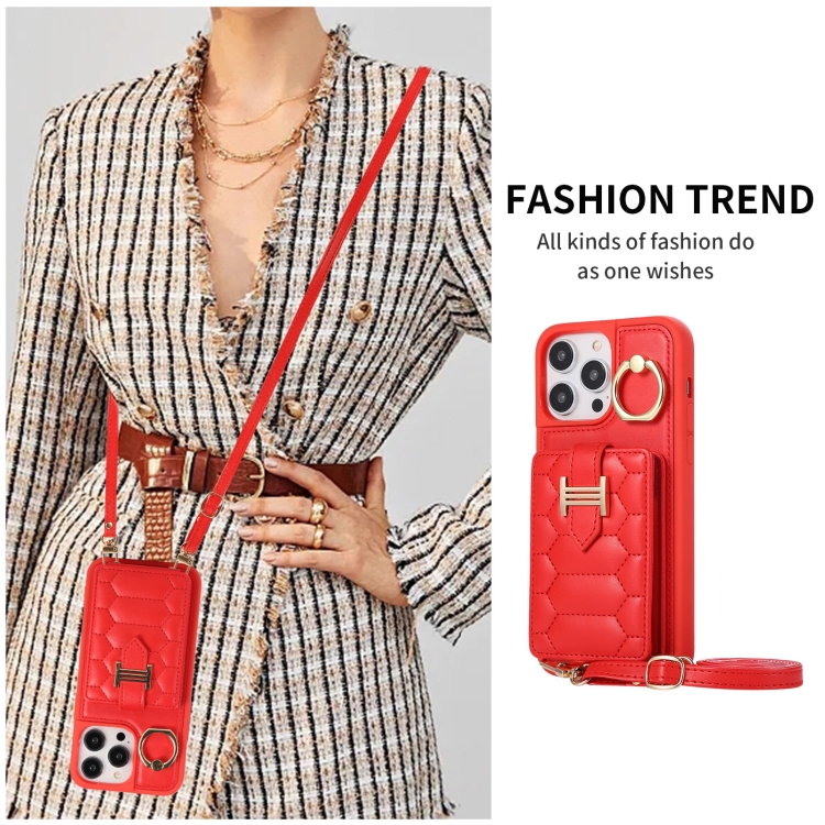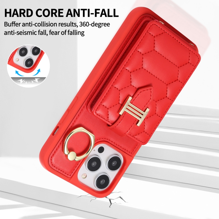 Funda para iPhone 14 Vertical Card Bag Ring Holder con Doble Cordón (Rojo)