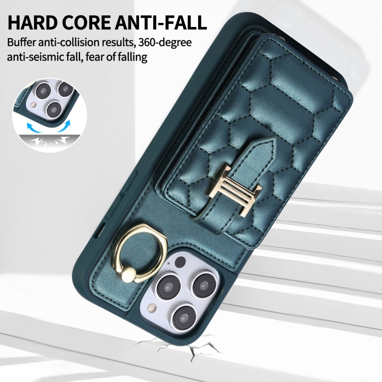 Funda para iPhone 14 Vertical Card Bag Ring Holder con Doble Cordón (Verde Oscuro)