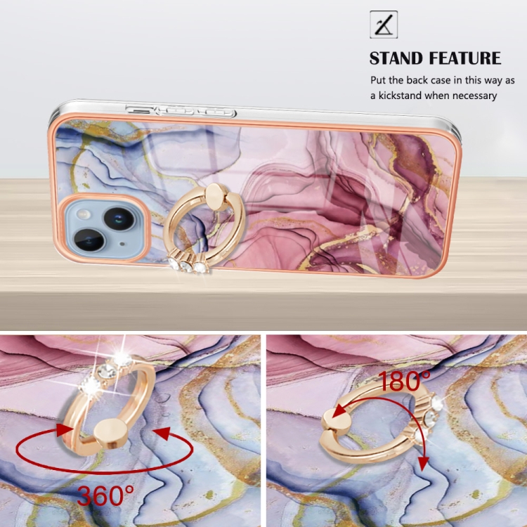 Caja de Teléfono para iPhone 15 IMD Doble Cara Mármol Galvanizado con Anillo (Rose Red)