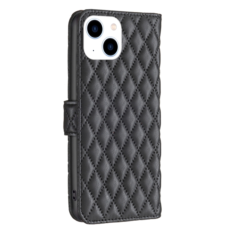 Funda para iPhone 15 Diamond Lattice Wallet Flip de Cuero para Teléfono (Negro)
