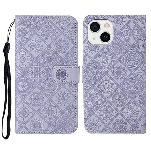 For iPhone 15 Ethnic Style Embossed Pattern Leather Phone Case (Purple)