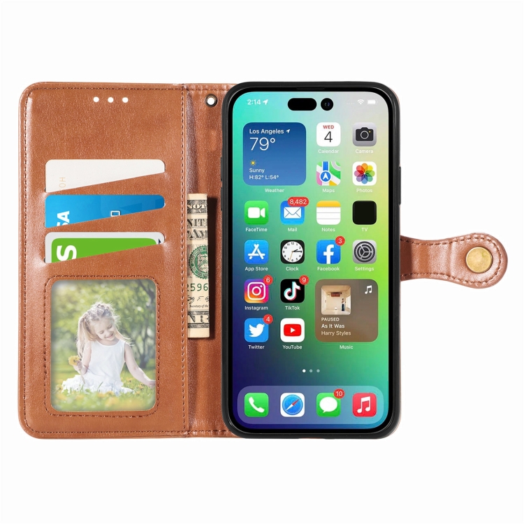 For iPhone 15 Retro Solid Color Buckle Leather Case (Brown)