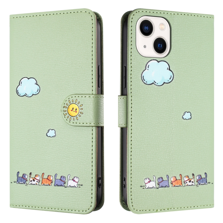 Funda para Teléfono iPhone 15 Cuero Gatos Dibujos Animados (Verde)