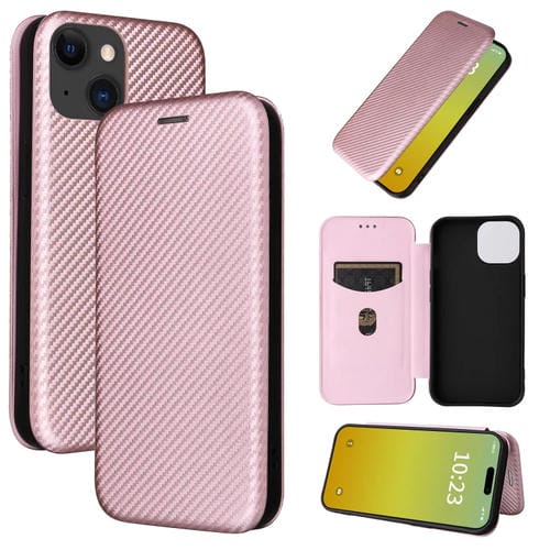 Funda de Teléfono para iPhone 15 con Tapa de Cuero y Textura de Fibra de Carbono (Rosa)
