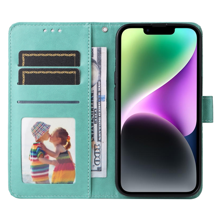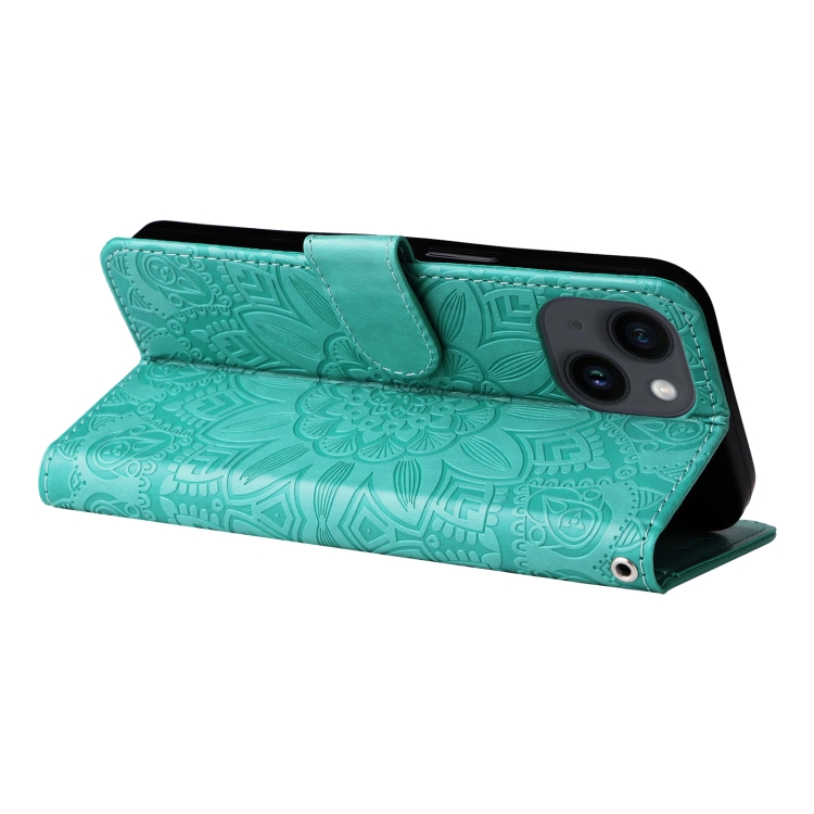 Funda de Teléfono iPhone 15 Cuero Estampado Girasol en Relieve (Verde)