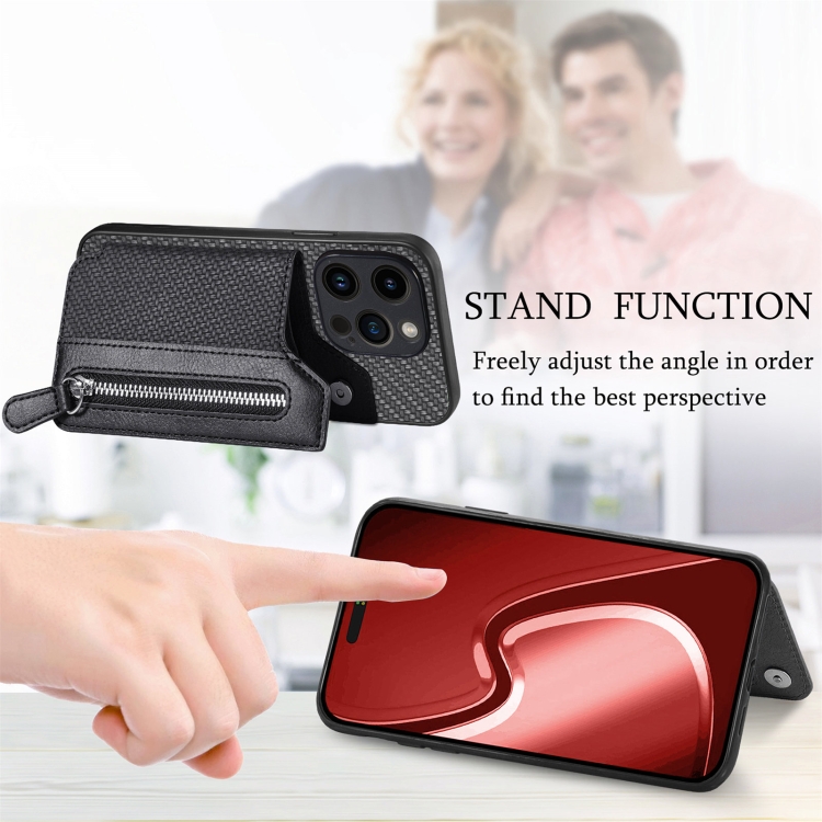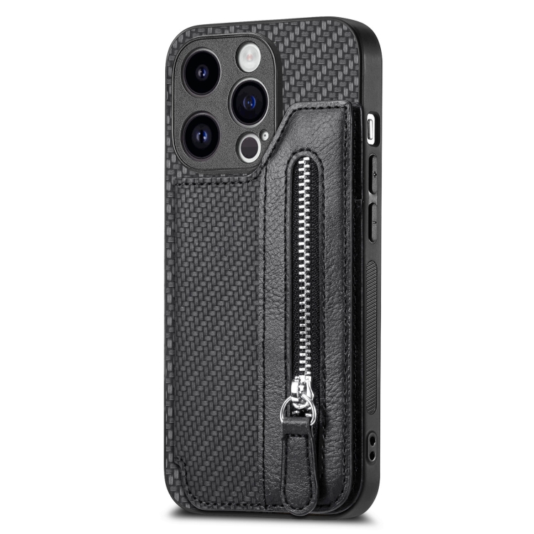 Funda para Teléfono iPhone 15 con Billetera con Cremallera y Tapa Horizontal de Fibra de Carbono (Negro)