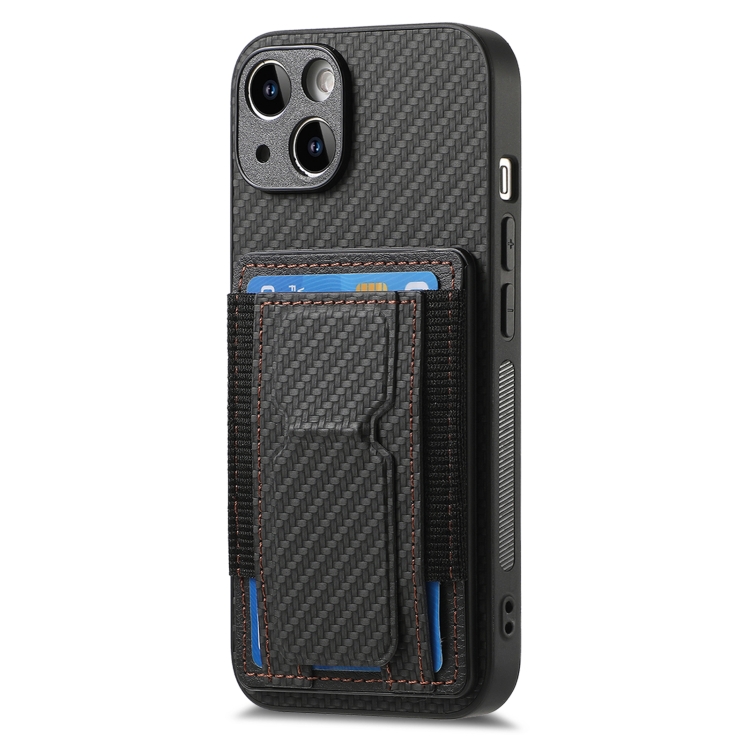 Funda para Teléfono iPhone 15 con Bolsa para Tarjeta Elástica y Soporte Plegable de Fibra de Carbono (Negro)