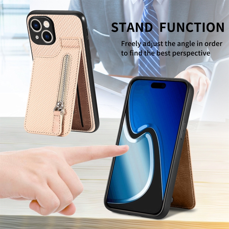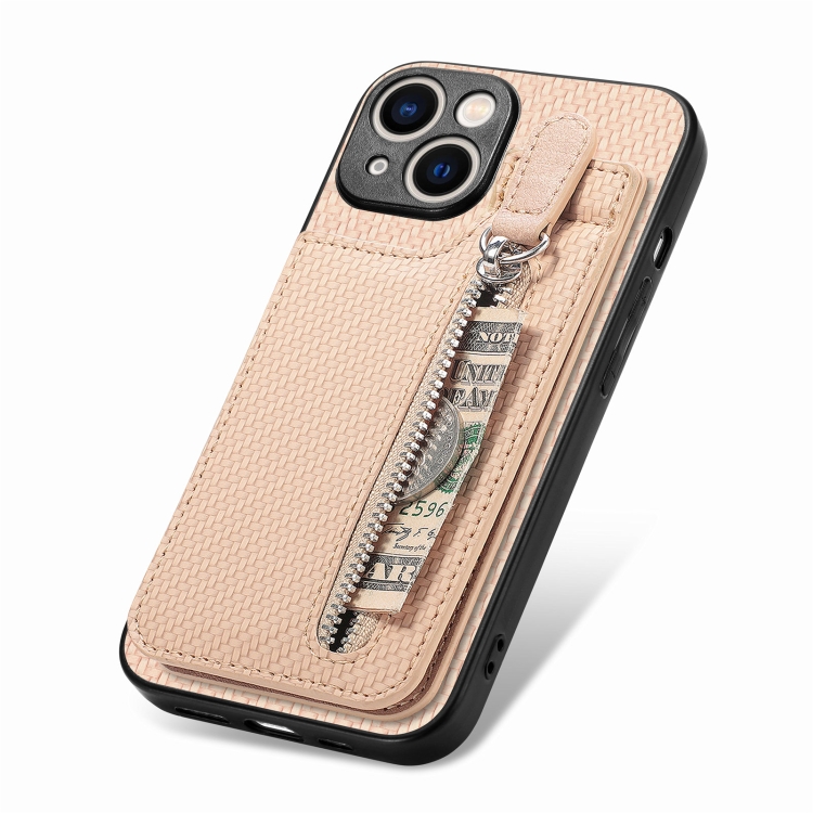 Funda para Teléfono iPhone 15 con Cremallera y Tapa Vertical de Fibra de Carbono (Caqui)