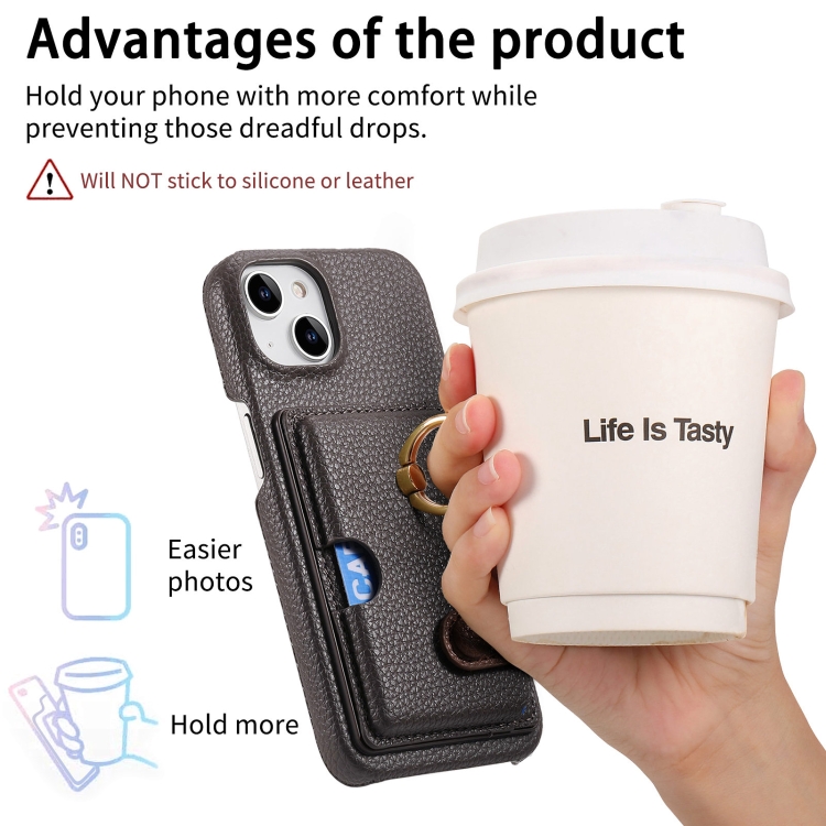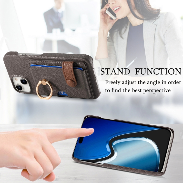 Funda para Teléfono iPhone 15 con Parte Posterior de Tarjeta y Anillo Borde de Aceite Cuero Litchi (Gris)
