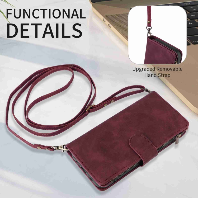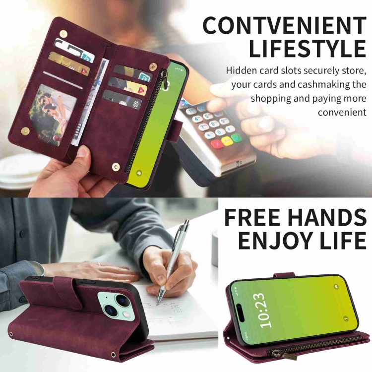 Funda para Teléfono iPhone 15 Cuero con Cremallera y Ranura para Tarjetas Cruzadas (Rojo Vino)