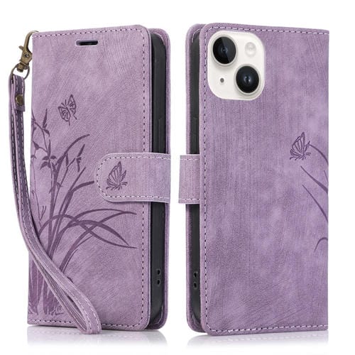 For iPhone 15 Orchid Butterfly Embossed Leather Phone Case (Purple)