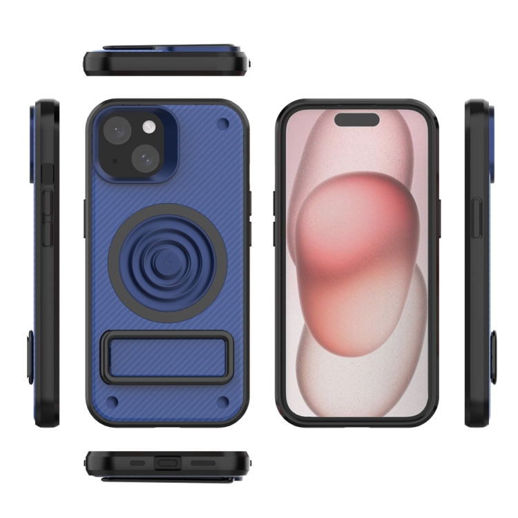 Funda para Teléfono iPhone 15 PC + TPU Textura Fibra de Carbono Soporte de Metal (Azul)