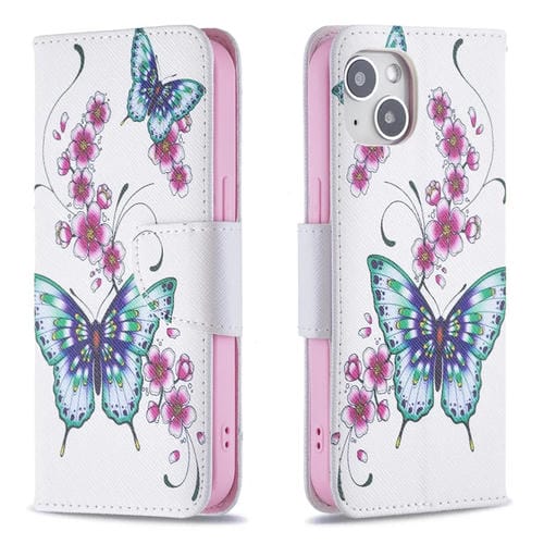 Funda de Cuero para iPhone 15 Patrón de Dibujo Coloreado con Tapa (Mariposa de Flores)