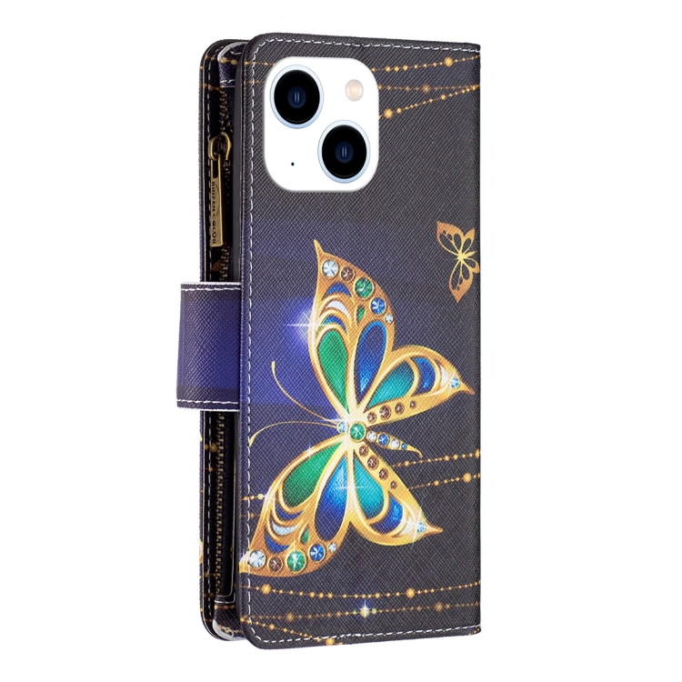Funda de Cuero para iPhone 15 Patrón de Dibujo Coloreado con Cremallera (Mariposa Grande)