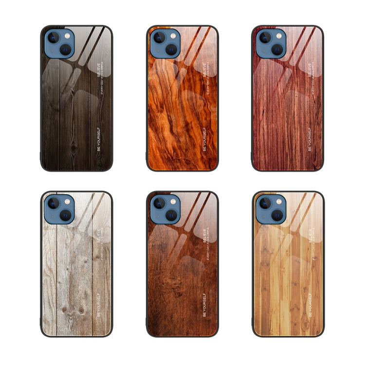 Caja de teléfono para iPhone 15 Plus de vidrio con grano de madera (Negro)