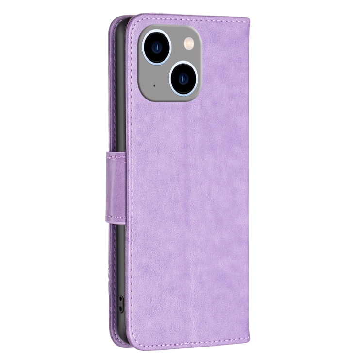 Funda para iPhone 15 Plus Cuero Estampado en Relieve Dos Mariposas (Púrpura)