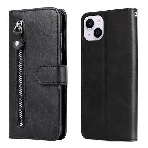 Funda de Cuero Becerro para iPhone 15 Plus con Textura Cremallera (Negro)